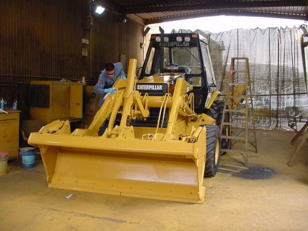 Caterpillar 446B Backhoe being prepped for spray-application of KrystalKote CTF.